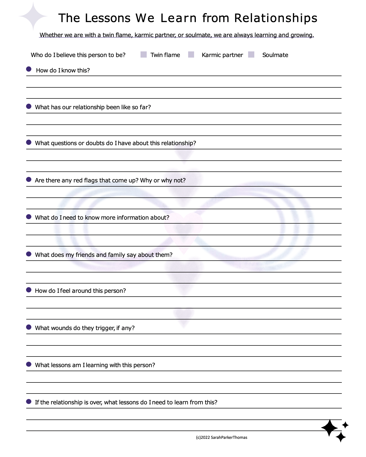 ❤️ Bonus! New 10 page printable worksheet. Use these pages to help you better understand (and heal) past relationships and identify new connections.