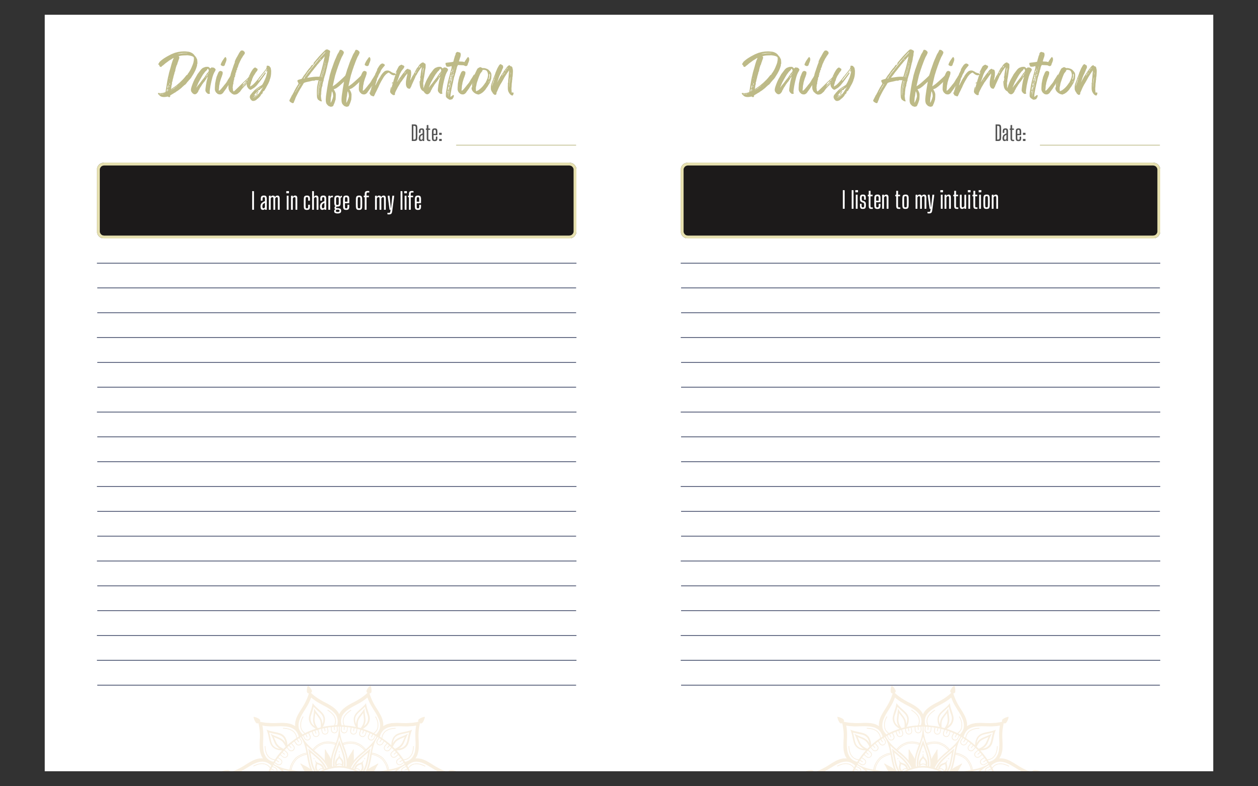 Experience the simplicity and ample writing space of this journal, designed to complement each daily affirmation. You also have the freedom to print and reuse it as often as you'd like. Unleash your creativity with additional pages for crafting personalized affirmations or jotting down meaningful notes. This journal is not just a product; it's a versatile tool on your journey to self-discovery.