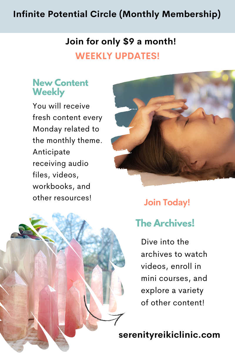 Embark on a transformative journey with our exclusive monthly membership, where you'll discover the answers you've been seeking for healing, personal growth, and unlocking innate potential. With over 20 years of tried & true experience to share we will explore diverse topics such as psychic development, wellness practices, Reiki, Shadow Work & much more, as each month unveils a new adventure in self-discovery.
