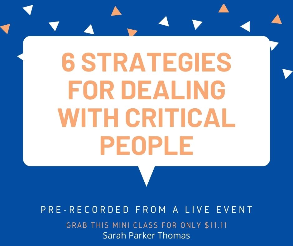 In this entertaining audio class Sarah will help you understand why people are critical and share actionable steps to deal with criticism. Learn the difference between "helpful" criticism and toxic behaviors, understand why some people feel it's their job to criticize and how to handle emotions associated with critical encounters.